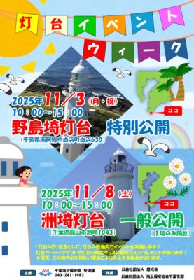 全国 野島埼灯台・洲埼灯台 灯台の日記念イベント 千葉海上保安部では、「灯台の日」を記念として、 野島埼灯台と洲埼灯台でイベントを実施します。 ・海上保安官のミニ制服を着用しての記念撮影 ・先着で灯台カード、灯台のペーパークラフト、缶バッジプレゼント... 2025年10月19日 第三管区海上保安本部交通部企画課